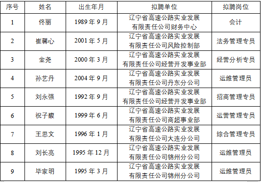 根據(jù)遼寧省高速公路實業(yè)發(fā)展有限責(zé)任公司招聘工作有關(guān)要求,經(jīng)過資格審核、筆試、面試等程序,確定以下人員為遼寧省高速公路實業(yè)發(fā)展有限責(zé)任公司擬聘用人員,現(xiàn)予以公示。
