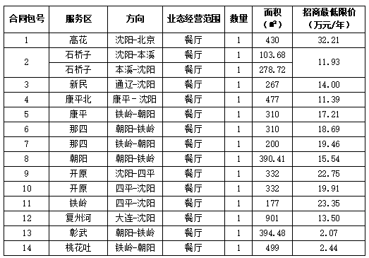 2.2招商范圍及合同包劃分:本次招商業(yè)態(tài)為石橋子、那四、開原服務(wù)區(qū)雙側(cè)餐廳共計(jì)6個(gè);高花(沈陽(yáng)—北京方向)餐廳1個(gè)、新民(通遼—沈陽(yáng)方向)餐廳1個(gè)、康平(鐵嶺—朝陽(yáng)方向)餐廳1個(gè)、康平北(康平—沈陽(yáng)方向)餐廳1個(gè)、朝陽(yáng)(朝陽(yáng)—鐵嶺方向)餐廳1個(gè)、鐵嶺(四平—沈陽(yáng)方向)餐廳1個(gè)、復(fù)州河(大連-沈陽(yáng)方向)餐廳1個(gè),彰武(朝陽(yáng)-鐵嶺)餐廳1個(gè),桃花吐(鐵嶺-朝陽(yáng))餐廳1個(gè),本項(xiàng)目共劃分為14個(gè)合同包。