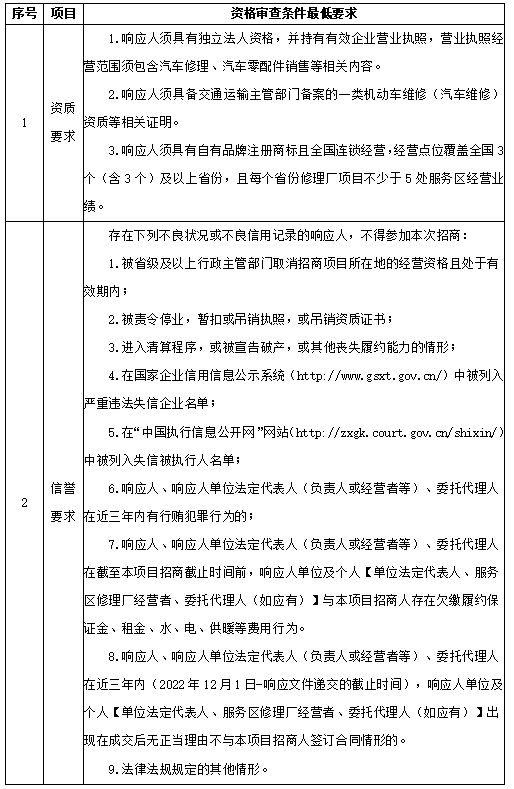 3.1本次招商要求響應(yīng)人必須同時(shí)具備的資格要求詳見(jiàn)下表: