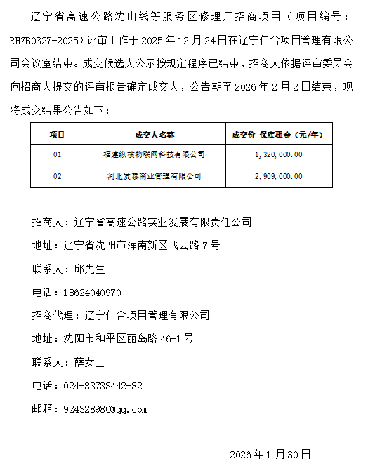 遼寧省高速公路沈山線等服務(wù)區(qū)修理廠招商項目成交結(jié)果公告