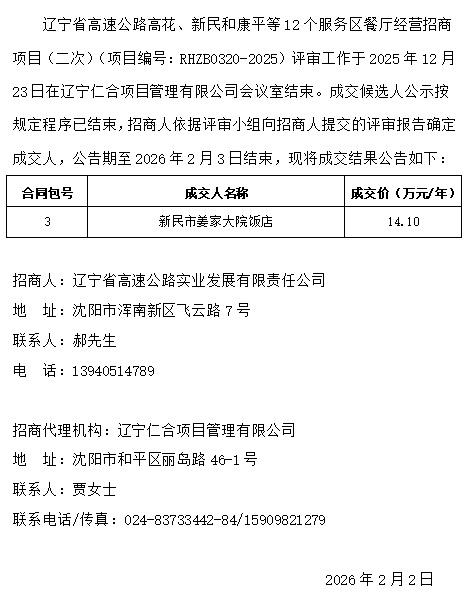 遼寧省高速公路高花、新民和康平等12個(gè)服務(wù)區(qū)餐廳經(jīng)營招商項(xiàng)目(二次)成交結(jié)果公告